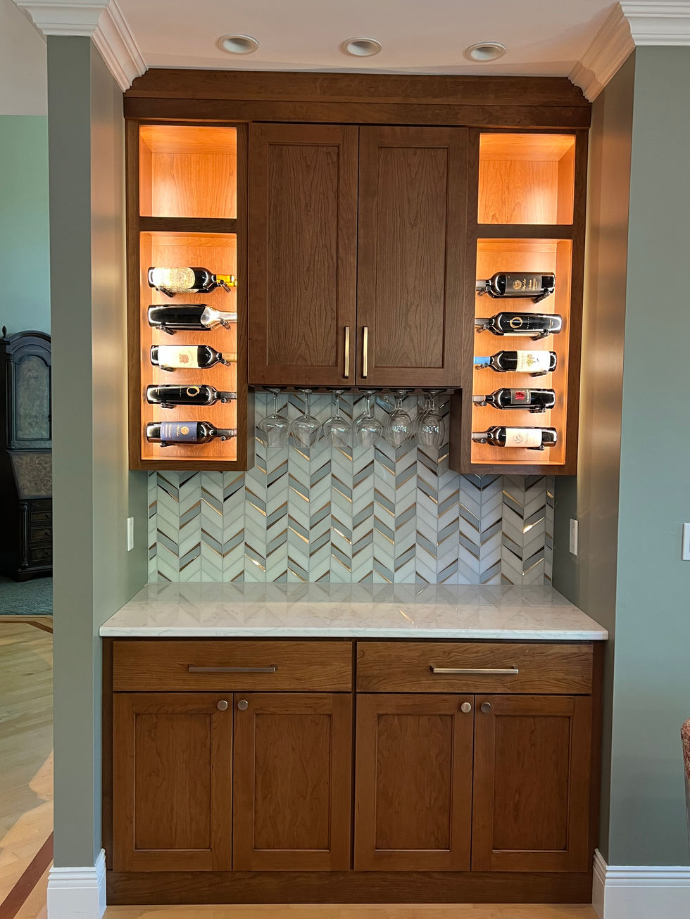 Discover our elegant cabinet designs featuring wooden cabinets with glass display, wine storage, and modern sink options. Our designs offer a perfect blend of functionality and style for your kitchen space.